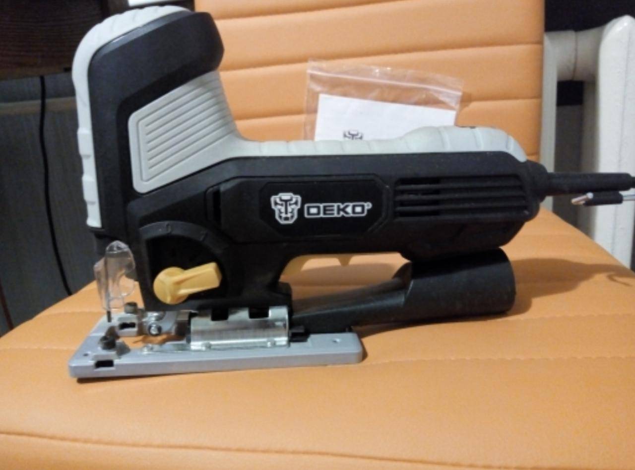 Электролобзик DEKO сочетает в себе невысокую стоимость и хорошее качество. Работает от сети, но имеет достаточно длинный шнур для удобной эксплуатации. Масса инструмента 1,9 кг позволяет спокойно работать одной рукой.