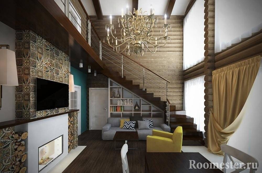 Особенным бревенчатое пространство внутри дома делает сочетание сразу нескольких европейских стилей: