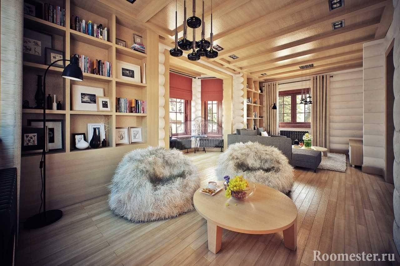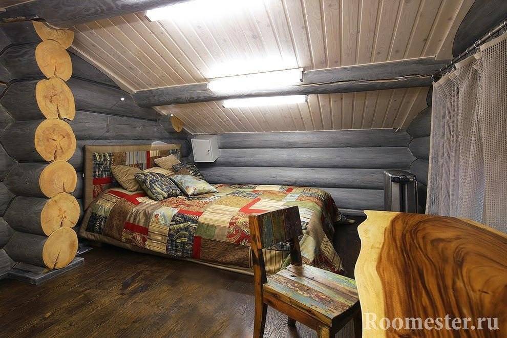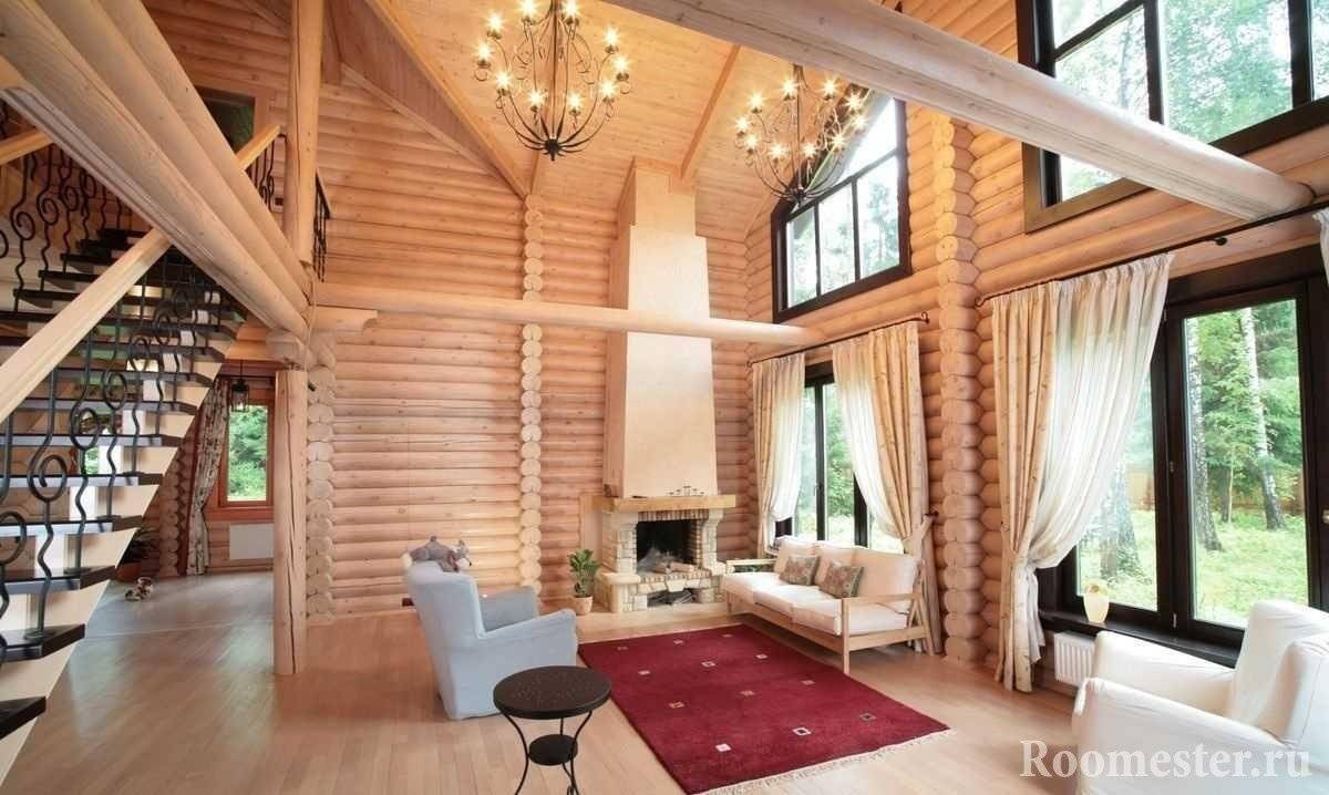 - Стены в гостиной и спальнях нужно отшлифовать и покрыть прозрачной пропиткой или матовым лаком, которые не изменят их цвет, но позволят подчеркнуть естественную фактуру натурального дерева;