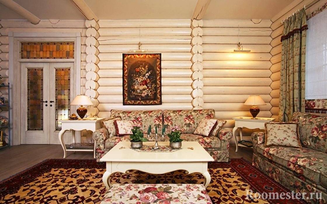 - Стены в гостиной и спальнях нужно отшлифовать и покрыть прозрачной пропиткой или матовым лаком, которые не изменят их цвет, но позволят подчеркнуть естественную фактуру натурального дерева;
