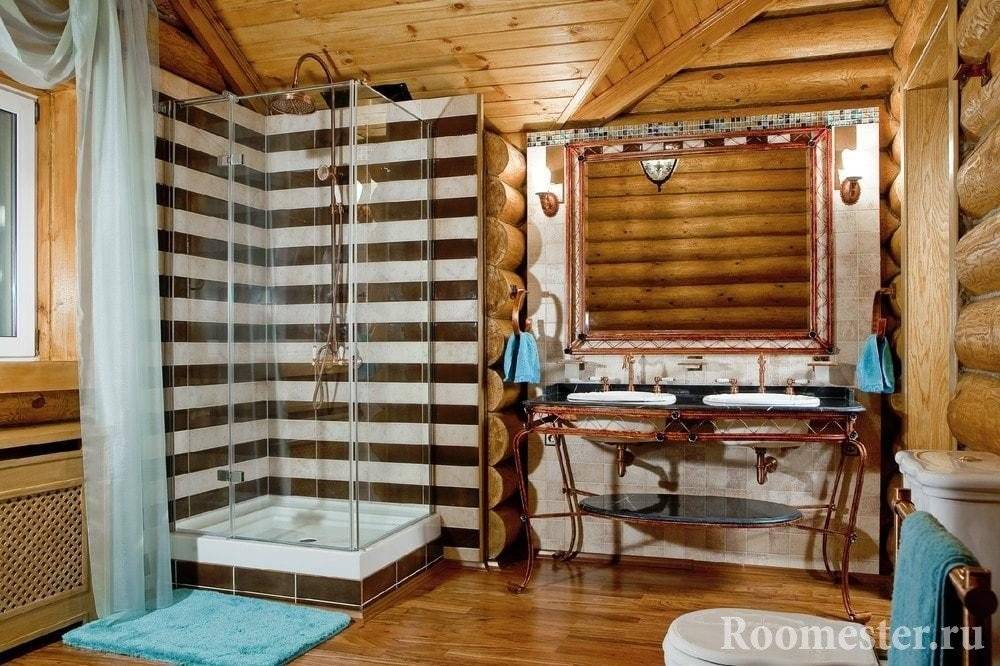 Соблюдая указанные условия дизайн ванной в доме из бруса возможно делать изящным, в стиле минимализма и любом другом. Светлую, темную – на вкус хозяев. Когда предполагается оставить открытие зоны с деревом, его лучше покрыть специальным водостойким лаком.