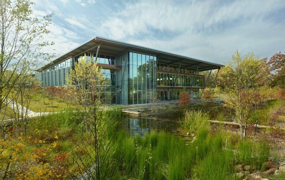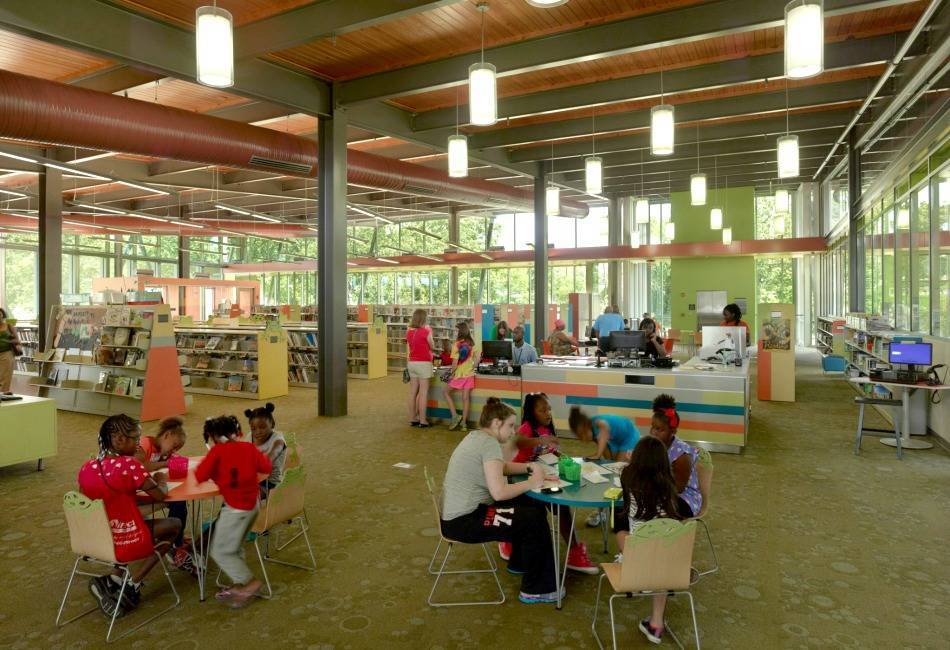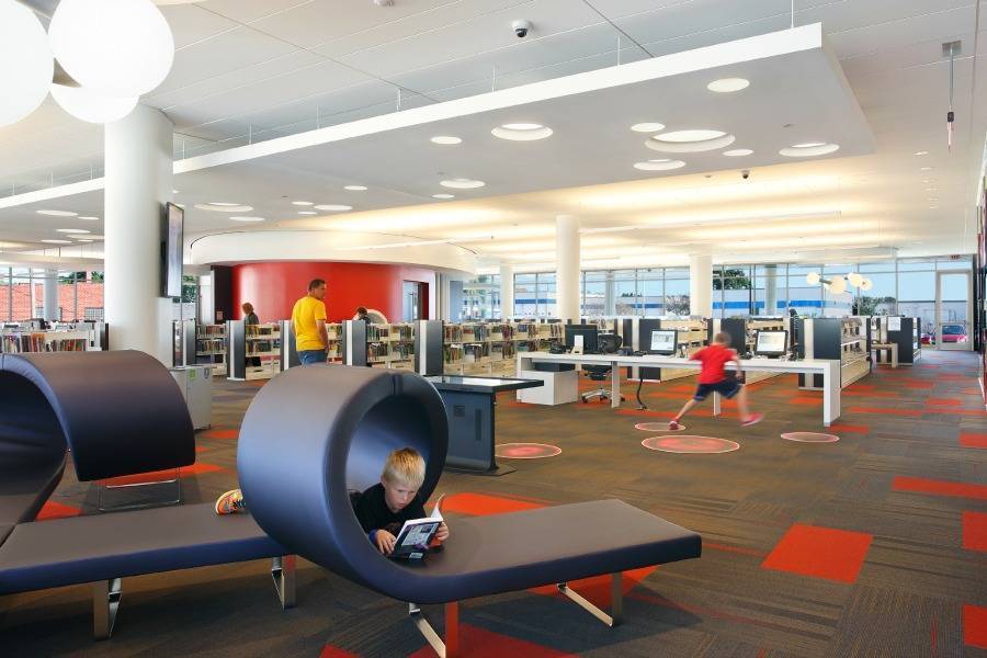 OPN Architects спроектировали эту библиотеку в соответствии с требованиями LEED Platinum, максимизируя дневное освещение и используя геотермальную систему, тем самым сводя к минимуму энергозатраты самого здания.