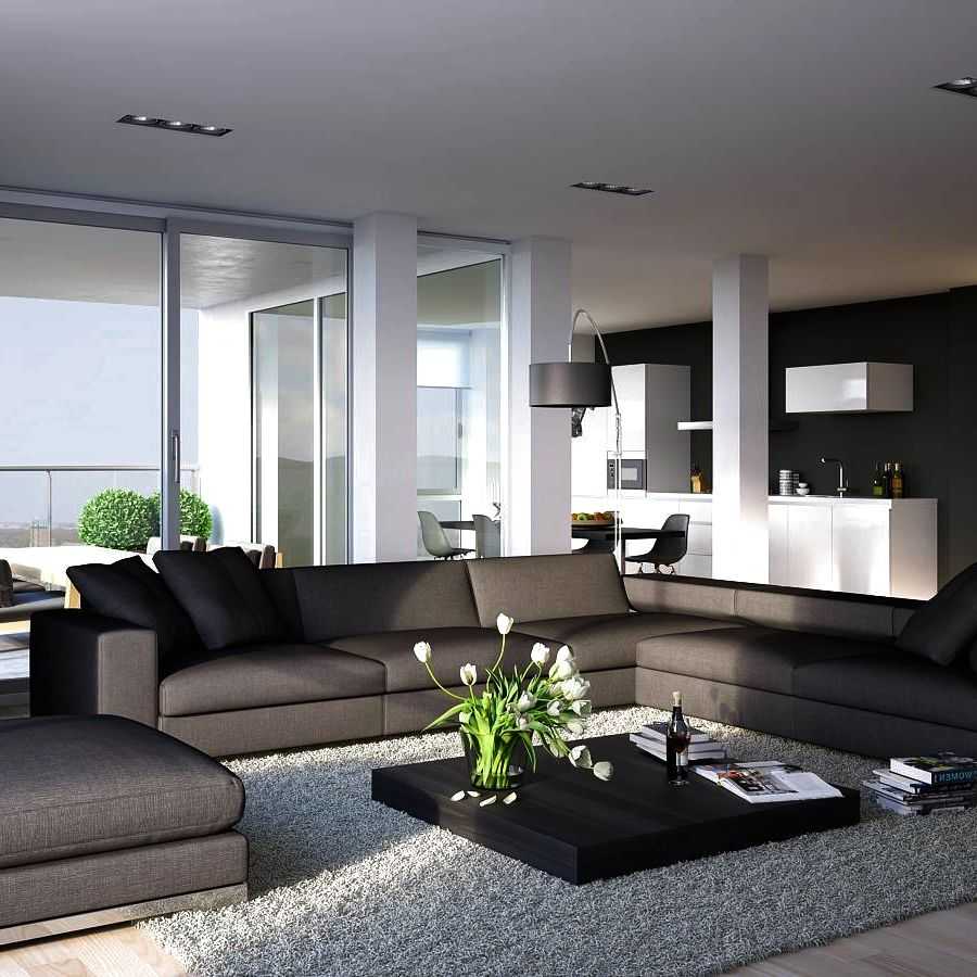 Оформление гостиной в современном стиле можно назвать полной противоположностью предыдущему примеру. В этом дизайне главенствуют простота, сдержанность, ненатуральные материалы и чёткие графические линии. На первый взгляд такое помещение немного напоминает офис, поэтому для создания более уютной обстановки следует дополнить современную технику и трансформирующуюся мебель ковровым покрытием и мягкими подушками.