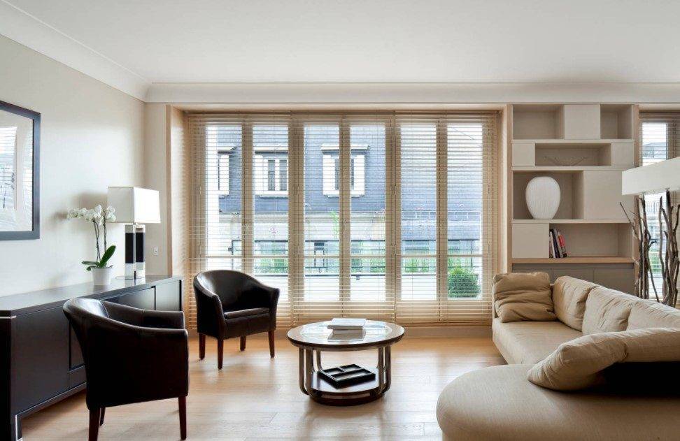 В большинстве примеров прямоугольной гостиной расположение двери напротив окна является стандартным, что визуально вытягивает и без того узкую комнату. Чтобы избавиться от «вагонного» эффекта дизайнеры советуют прибегнуть к небольшим хитростям и увеличить размер дверного проёма или вообще заменить его аркой. Также помогут решить эту проблему вертикальные рисунки или глянец на широких стенах.
