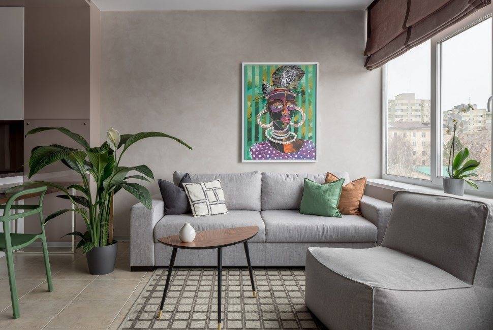 Среди актуальных для отделки стен также стоит выделить серый цвет. Ранее его старались избегать в оформлении жилого помещения, считая данный вариант слишком скучным, мрачным. Однако сейчас он буквально на пике популярности. Дизайнеры отмечают, что серый цвет многогранный и способен сделать интерьер как строгим, так и лаконичным или же элегантным. При этом он замечательно сочетается с ярким розовым, синим, желтым и зеленым цветом. Это позволяет чуть больше экспериментировать. То есть в такой гостиной можно использовать пышные растения, оригинальный декор или же яркий текстиль. Главное, чтобы все эти детали подчеркивали выбранный стиль интерьера.