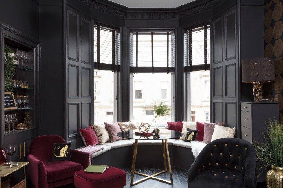 Отдельно стоит отметить интерьер гостиной в темно-зеленом, темно-коричневом или темно-фиолетовом цвете. Безусловно, такой вариант подойдет не всем. Он будет уместным исключительно в том случае, если окна выходят на солнечную сторону. Только при этом условии в гостиной будет достаточное количество дневного света. Если же у вас противоположный вариант, то лучше присмотреться к более теплым тонам.