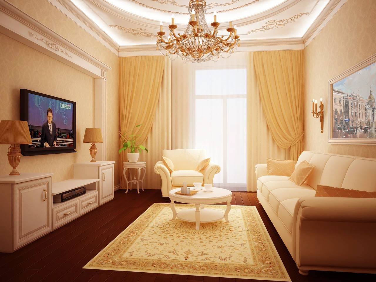 Пожалуй, самым универсальным во все времена будет бежевый цвет обоев. Это не удивительно, ведь теплая цветовая гамма всегда создают особую атмосферу уюта, мягкости и семейного тепло. А ведь именно к этому и стоит стремиться, оформляя гостиную.
