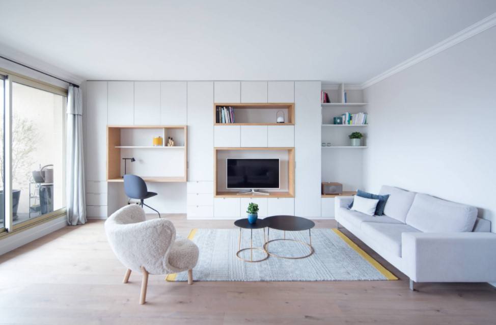 Специфика такого дизайна заключается в минимальном количестве мебели и элементов декора. Никаких лишних аксессуаров и украшений, принтов или сочетания нескольких оттенков. Функциональная мебель и максимум пару оттенков во всей гостиной.