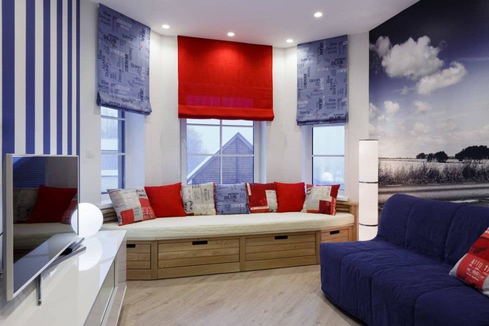 Выбор интерьера в скандинавском стиле просто идеально вписывается в небольшую площадь гостиной. Всё что нужно для такого оформления, это не загромождать окна занавесками, а использовать римские шторы или жалюзи, которые прекрасно защищают от посторонних глаз и не препятствуют проникновению света в помещение. Также следует отдать предпочтение светлым материалам, которые прекрасно сочетаются с яркими акцентами в виде подушек, статуэток или настенных часов.