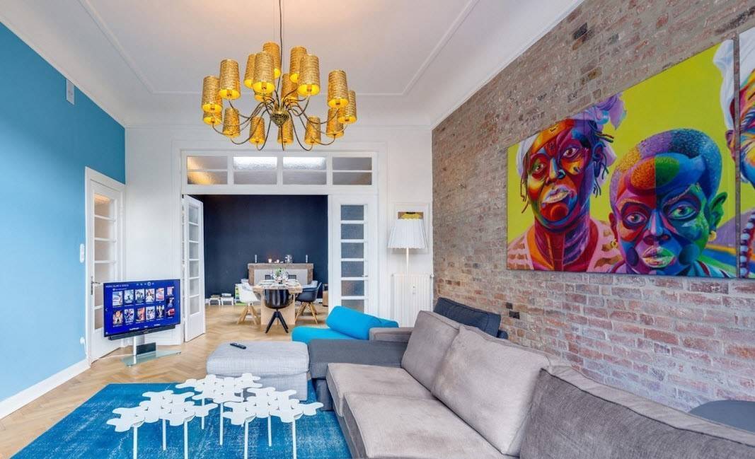 - лофт – обширное пространство с открытой планировкой, оштукатуренные либо кирпичные стены, мебель «под старину». Голубой цвет здесь подчеркнет холодность, кажущуюся необжитость помещения;