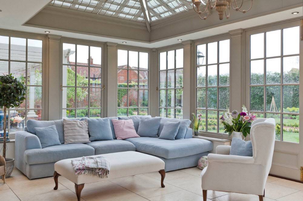 Голубой угловой диван в светлой гостиной