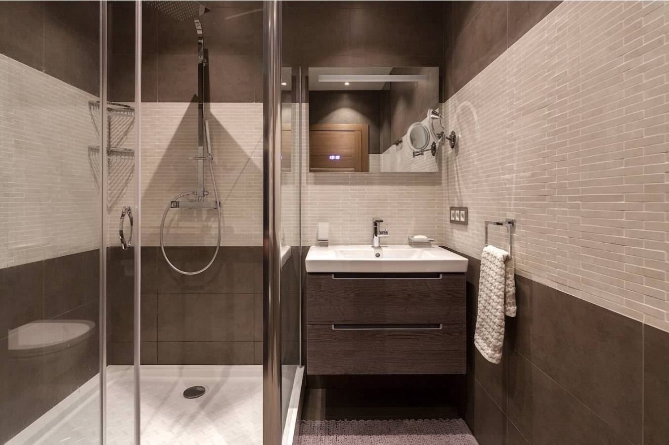 Экологическую направленность придадут интерьеру материалы, имеющие природный коричневый тон – терракотовая плитка, природный камень, кирпич. Сочетание белой сантехники с темно-коричневой отделкой смотрится очень стильно.