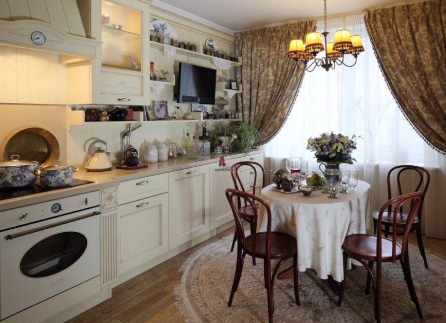 В целом отделка стен может быть выполнена штукатуркой, а для фартука надо выбрать стильную плитку, например, белую с узорами из цветов или искусственно состаренную. На полу тоже лучше уложить плитку или камень. В обеденной зоне поставьте белый деревянный стол, а вокруг несколько изящных стульев, обитых тканью в цветочек. На скатерти и шторах может быть кружевная отделка, весь текстиль должен сочетаться между собой.