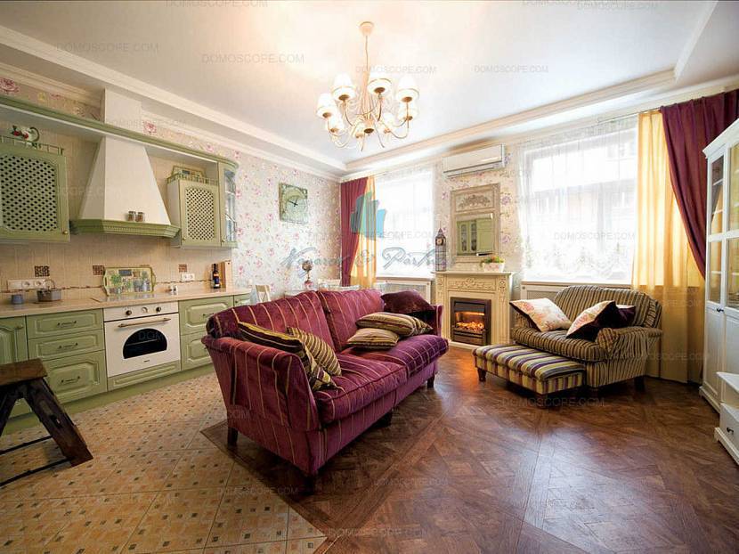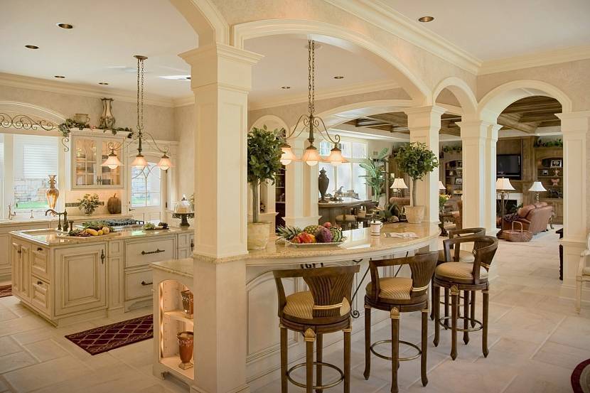 Объединение в одном помещении функций трех комнат — кухни, столовой и гостиной, может стать выгодным решением, повышающим комфорт жизни. Успешная реализация плана во многом зависит от конфигурации и объема помещения. Например, в комнате L-образной формы зонирование происходит естественным образом. Главным вопросом для организации кухни гостиной прованс становится грамотное выделение места под каждую зону. Для деления используют несколько приемов: