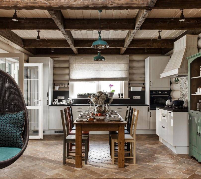 В деревянном доме чаще всего оформляют интерьер гостиной, столовой и кухни в одном из деревенских направлений – кантри, прованс, шале. Это простая мебель из массива древесины, натуральный текстиль, природная палитра. Совмещенная с гостиной рабочая зона может быть отделана керамической плиткой в ее естественной гамме. Фартук может быть декорирован кафельной мозаикой.