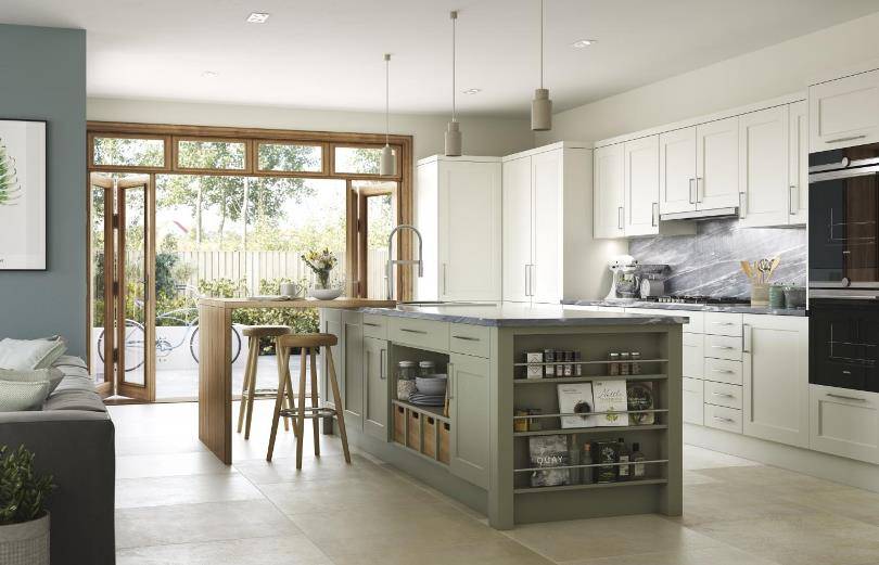 Современная кухня с красивыми фасадами цвета нежной мяты
