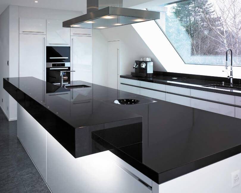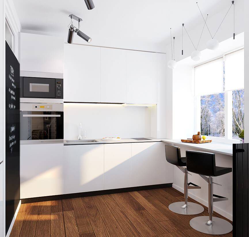 Стильно смотрится молочный или черно-белый интерьер в такой кухне. К основному светлому тону можно добавить несколько ярких акцентов. Как пример, красочные жалюзи или декорированная столешница.