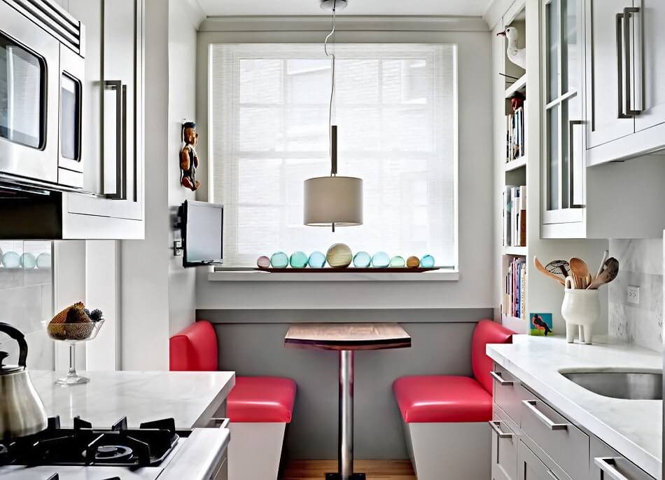 Тандем красного с белым способен задать настроение и преобразить небольшое кухонное пространство