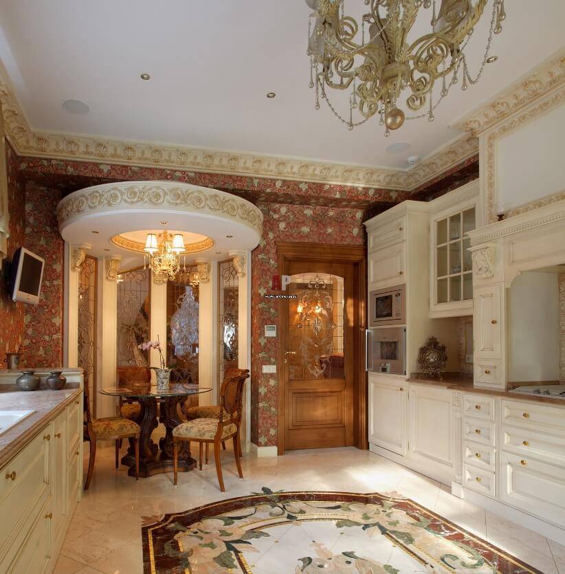 Группа классических, так сказать «королевских», вариантов оформления предполагает роскошную отделку. Столовая в частном доме в таком интерьере будет не просто полноценной – в виде стола и группы стульев со спинкой, но и «кульминацией» композиции – местом соблюдения семейных традиций, для общения и приема гостей. Кухня будет также богатой – с соответствующей отделкой, использованием декора в виде позолоты, резьбы, лепнины. Богато смотрится гостиная, как и обеденная группа, с выходом на террасу. Обычно в загородном коттедже при это окна выполнены во всю высоту помещения и органично украшены элегантными драпирующимися шторами.