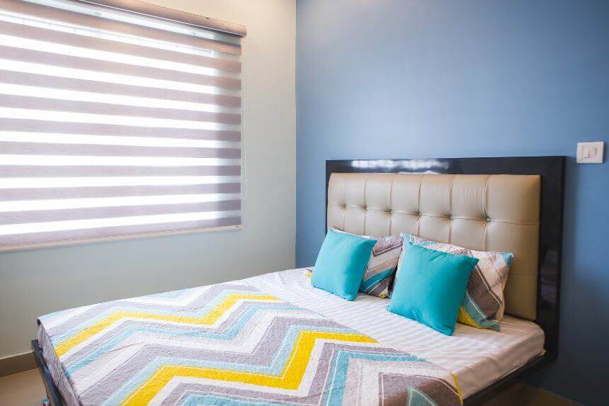 В зоне спальни, если она расположена у окна, можно использовать однотонные плотные шторы прямого покроя.