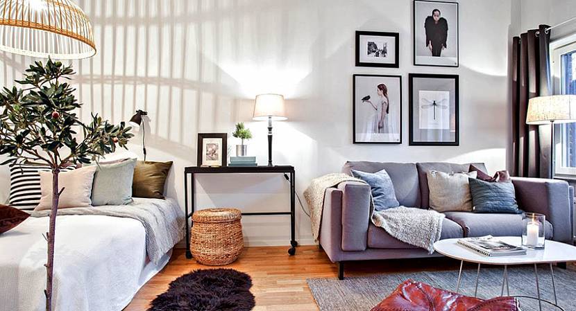 Если Вы решили оставить первозданную планировку или же наличие конструкций не допускает демонтаж, ознакомьтесь, как в данном случае организовано зонирование комнаты в однокомнатной квартире. Часто, перегородками (шторами) «маскируется» спальня, а на виду остается гостиная.