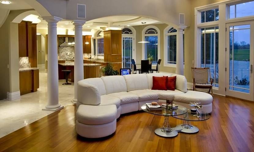 Существует множество современных архитектурных направлений. При всех своих общих чертах они имеют и различия. Например, популярный сегодня конструктивизм отличается наличием ломаных линий, которые и выполняют функцию декора. Открытые пространства домов в этом стиле не делят на функциональные зоны. В качестве акцента можно повесить на стену большую картину, выполненную в ярких чистых красках.