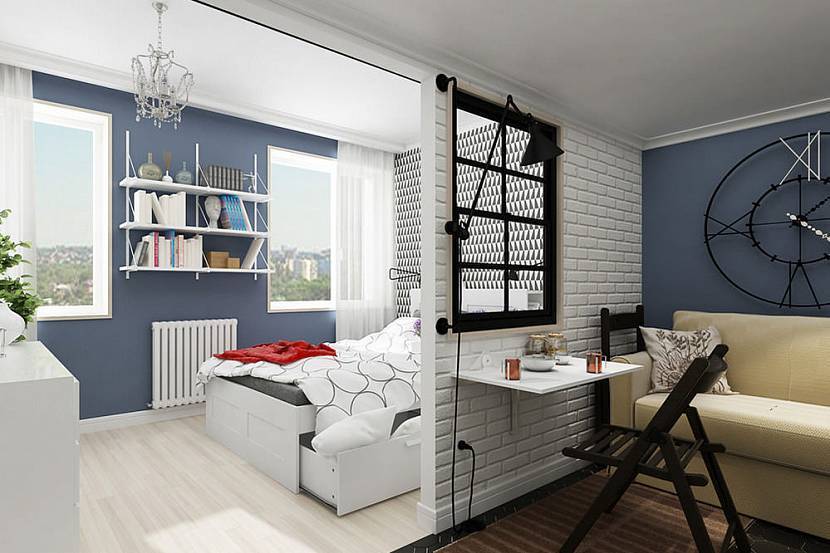 Проще всего подчеркнуть разделение комнаты на зоны с помощью диван-кровати конструкции «аккордеон». Он ставится перпендикулярно стене. Повернутый к зоне гостиной, он создаст дополнительные посадочные места. Если он повёрнут к окну, у спинки со стороны зоны гостиной можно ставить стеллаж, или прислонить складной стол после ухода гостей