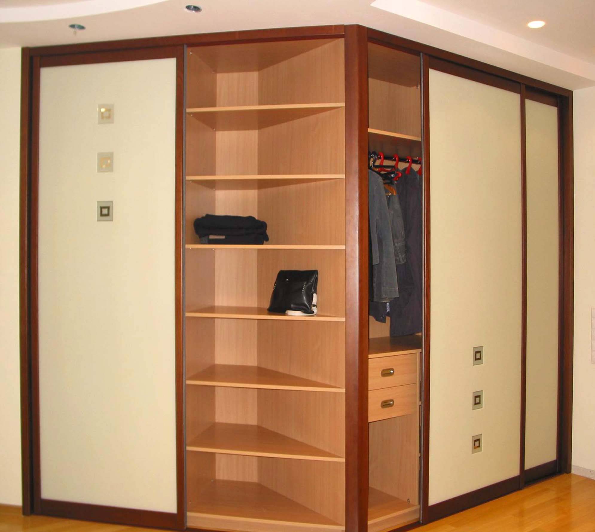 Если в прихожей присутствует угол, то используйте его с пользой. Попробуйте разместить, к примеру, там небольшой шкаф-купе. Или же обычный шкаф — что более вашей душе угодно.