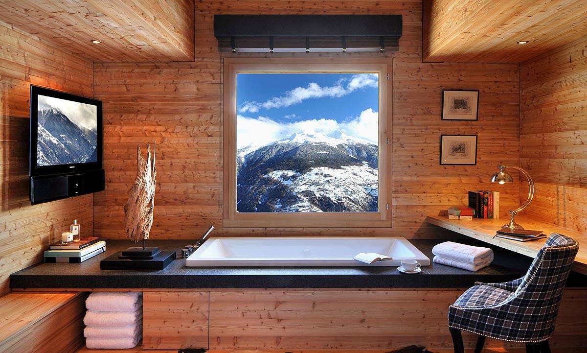 Ванна в стиле шале — это уединение в убежище. «Для полнейшей релаксации, заведите большую ванну, придерживайтесь успокаивающей палитры, убедитесь, что в комнате есть хороший свет, выход на улицу», — пишет Бингам. Ванна, полностью обшитая древесиной, определит главное настроение, напомнит о красоте вокруг.