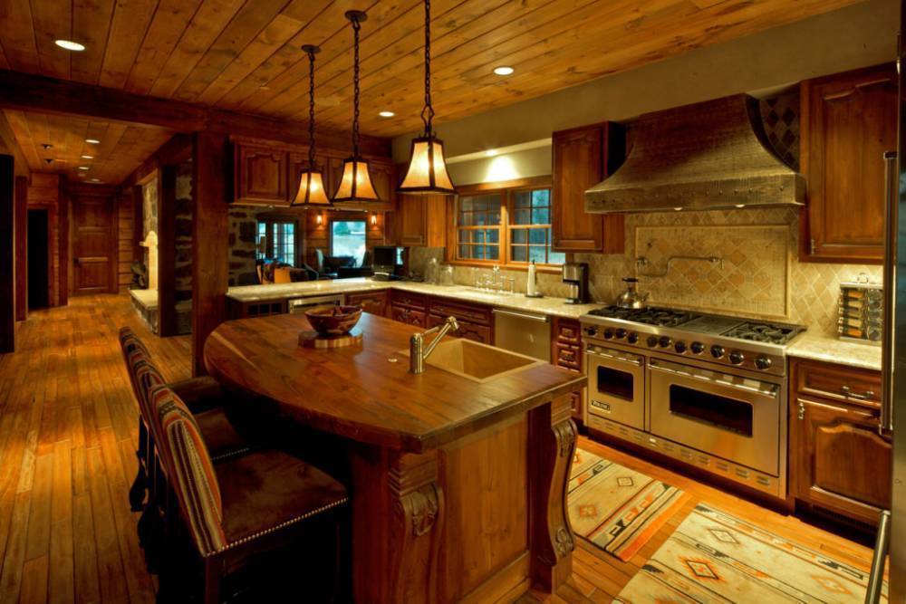 Для отделки стен применяются панели из древесины, плитка либо декоративная штукатурка. Для покрытия пола используется ламинат или камень. В последнем случае стоит позаботиться о подогреве. Гарнитур выбирают из дерева, фасады можно оставить натурального оттенка или покрасить. Богато и элегантно будет смотреться столешница из искусственного камня либо мрамора.
