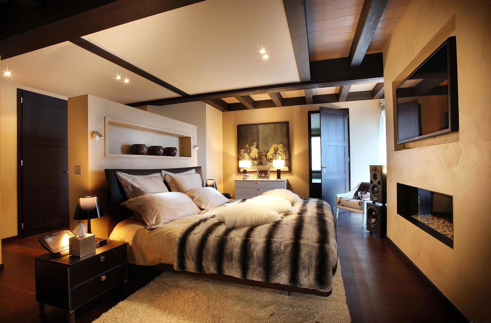 Бежево-черная спальня в стиле шале