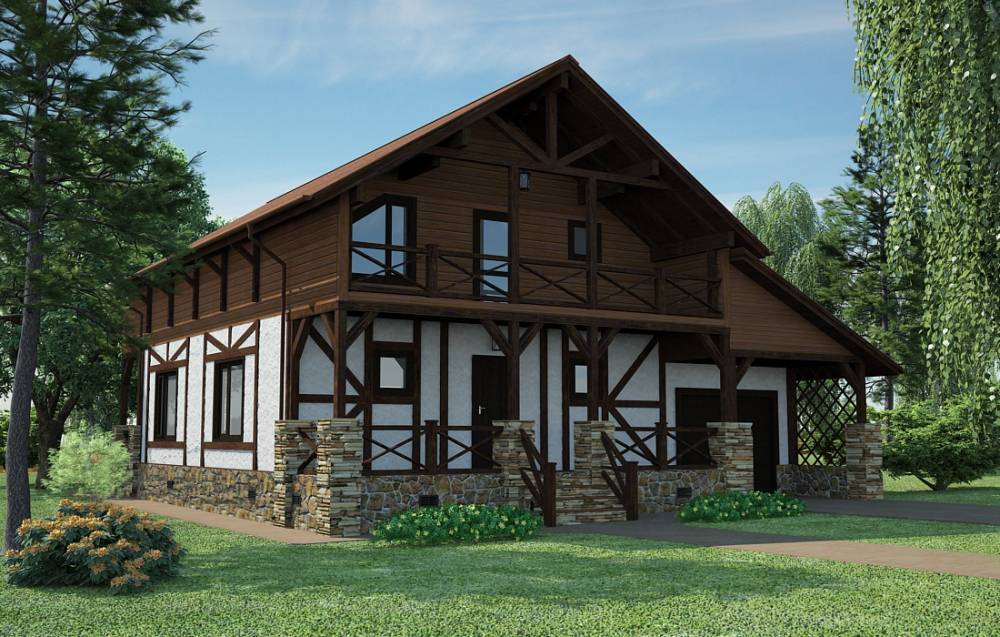 - отделка — штукатурка фактурного типа со вставками из камня или дерева;