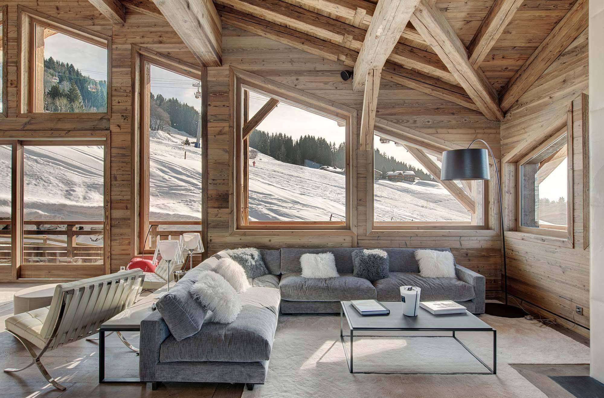 Гостиная с большими окнами в стиле шале