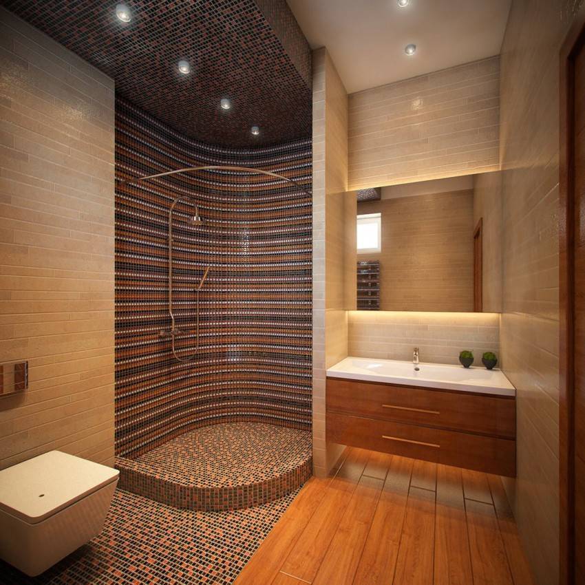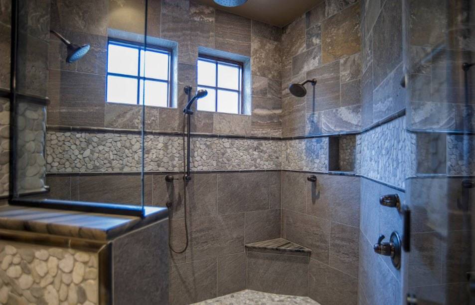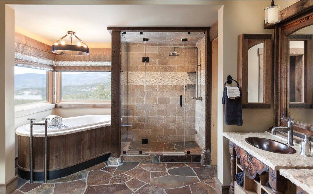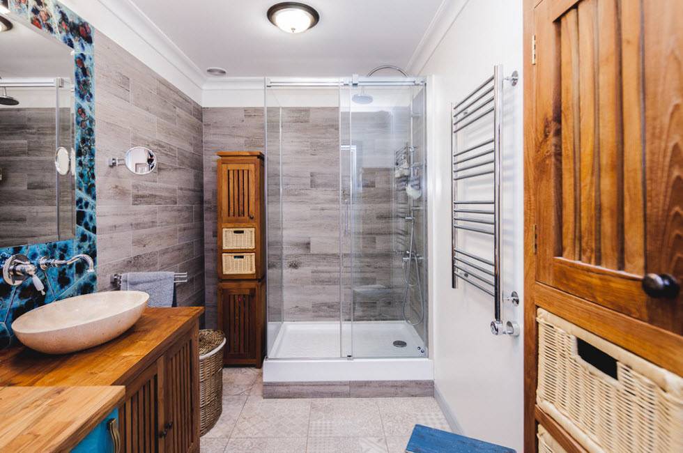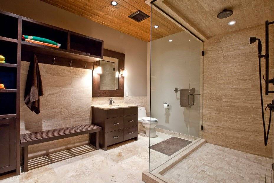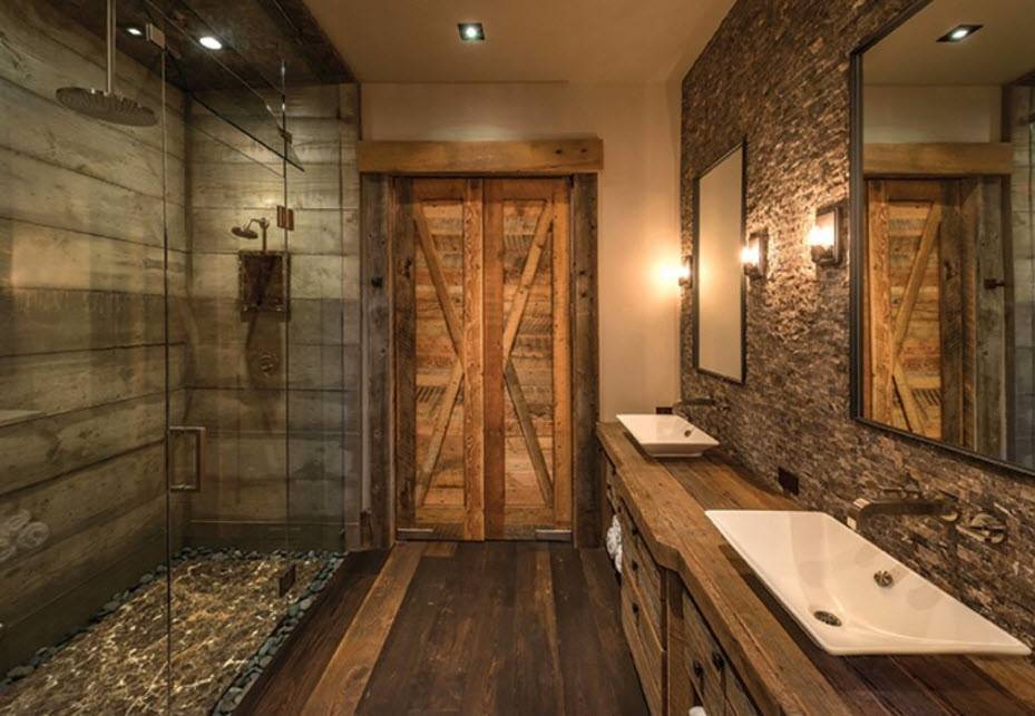 Что касается других материалов, то для отделки ванной комнаты с душевой в загородном доме можно использовать: