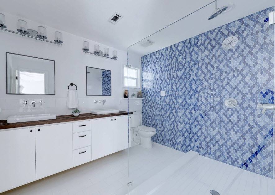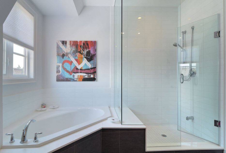 Белоснежный интерьер в ванной с душевой – самый распространенный вариант оформления цветового решения при наличии небольшого помещения. Однако, кристально белая ванная комната часто ассоциируется с неприятными воспоминаниями о стерильном хирургическом отделении больницы. Для придания определенный живости белоснежному фону, достаточно просто повесить яркие банные полотенца и положить пестрый коврик возле раковины.