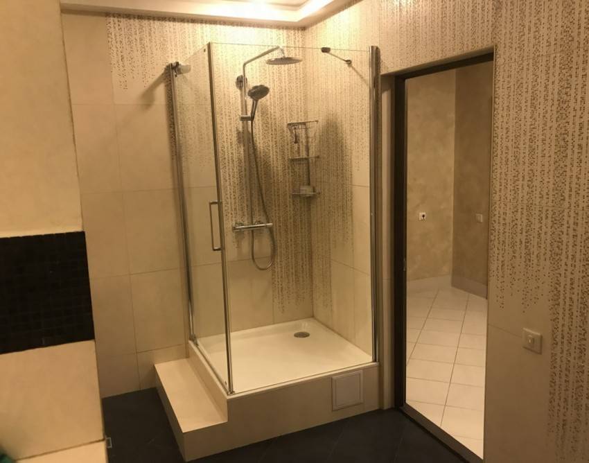 Второй фактор — высота и количество стенок. В полноразмерной душевой есть все 4 (или больше) стены. Так достигается максимальная герметичность, но тратится место на зазор между стеной ванны и стенкой кабинки. Альтернатива — душевой уголок, который крепится к стене. Высота стенок и наличие крыши могут оказаться важными в помещениях с низкими потолками.
