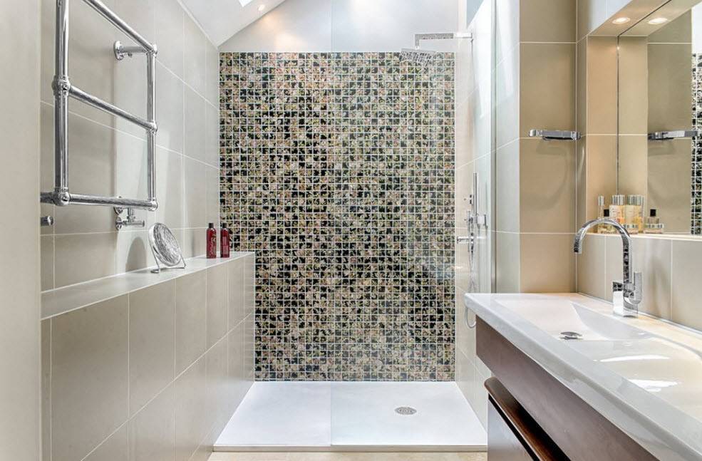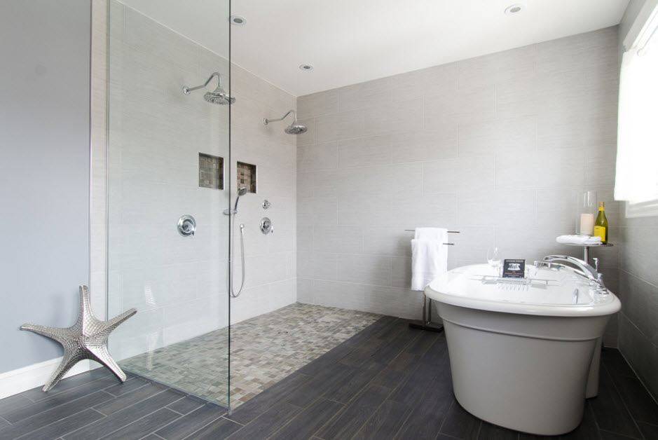 Для облицовки стен, пола и потолка можно использовать различные отделочные материалы. К счастью, производители предлагают широкий ассортимент, что позволяет каждому выбрать оптимальный вариант, учитывая стиль интерьера, внешний вид и эксплуатационные характеристики материалов, а также их цену. Сразу отметим, что деревянная ванная комната с душевой – это крайне невыгодный вариант, ведь природный материал подвергается воздействию влаги, теряя свои свойства. Во время эксплуатации душевой не исключено, что дерево начнет впитывать влагу, что приведет к образованию микроорганизмов (грибков и плесени), разрушающих материал.