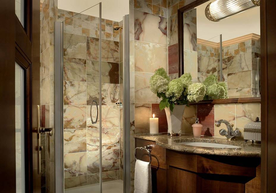 Чтобы вписать душевую кабину в классическую ванную комнату, используй элементы более современной неоклассики или дизайнерскую состаренную сантехнику. Основные цвета – бежевые, коричневые, пастельные и сложные темные оттенки. В качестве украшений – лепнина, потолочные розетки, светильники с хрустальными подвесками, тяжелые рамы для зеркал.