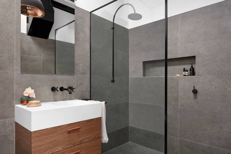 Серая отделка стен в сочетании с белой сантехникой создает ультрасовременный внешний вид комнатыИсточник roomester.ru
