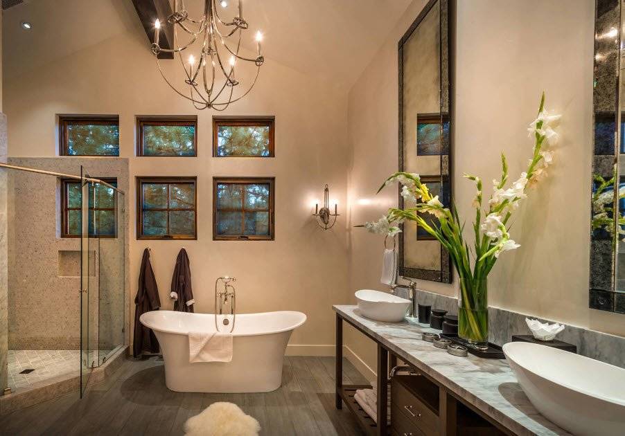 Современные интерьеры сочетают классические черты с прагматичностью и функциональностью. Они эклектичны и разнообразны, поэтому можешь комбинировать натуральный камень с акрилом и хромом, а состаренное дерево – с ультрасовременными душевыми кабинами. Чтобы не перегружать пространство, уравновесь игру фактур простотой форм и планировки.