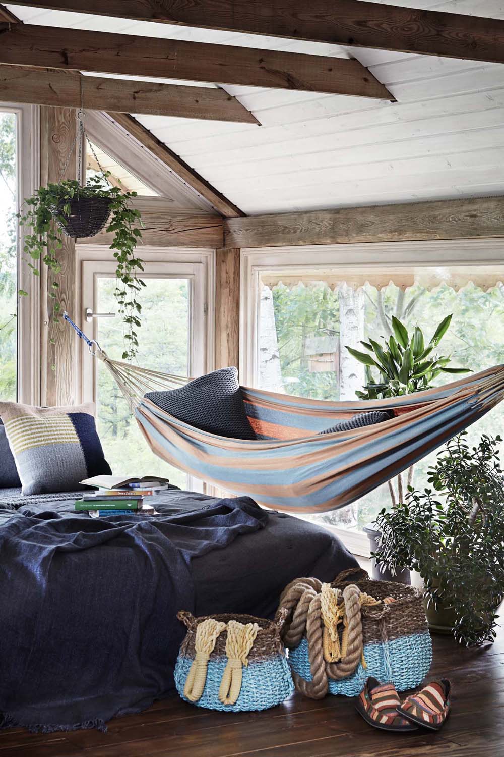 Деревянные акценты абсолютно необходимы в стиле загородного дома. Смело выбирайте мебель с грубыми рабочими поверхностями и элементами, которые специально не обрабатывались. Старые деревянные изделия также очень приветствуются: вытертые полы и окна в потрепанных рамах — отличная идея! Кроме того, вы можете легко достичь интересных акцентов из ротанга и плетения.