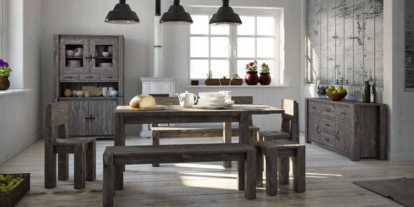 Часто владельцы объединяют рабочую кухонную зону со столовой. Классическая модификация в современном стиле отлично будет сочетать дерево и стекло. Индустриальный стиль предполагает использование практичных промышленных деталей: труб, проводов, ламп. Сельский вариант с плетеными элементами и натуральным деревом создаст уютную атмосферу.