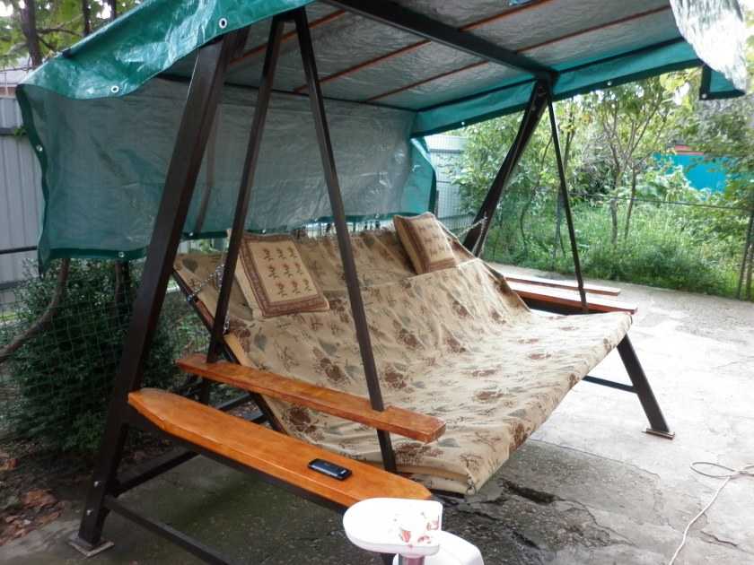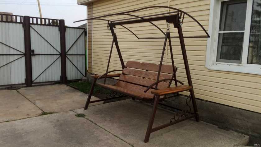Это, пожалуй, самый интересный и удобный вариант качели для украшения приусадебного участка, но тем не менее, сложный в изготовлении. Рассмотри алгоритм действий подробно.