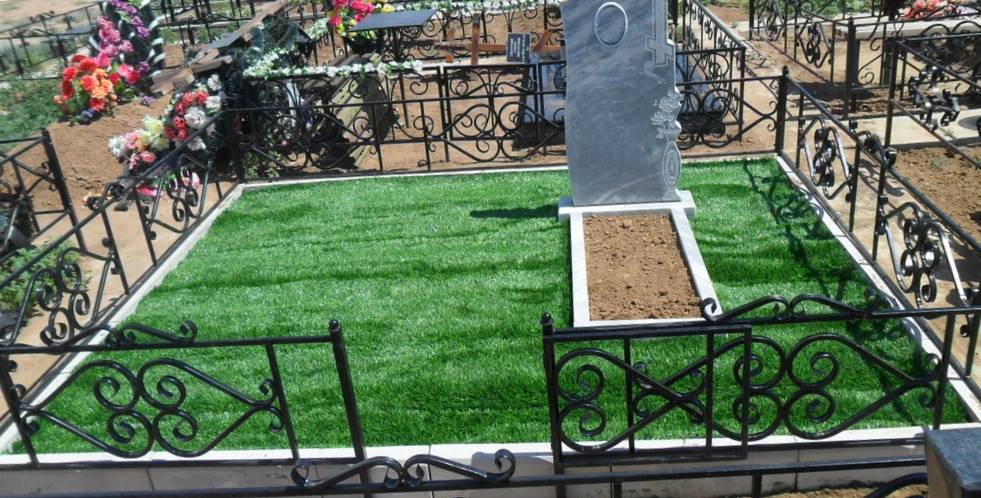Искусственный газон будет служить долгое время, и особый уход за ним не нужен. Можно приобрести и семена обычной травы для газона, но ее нужно будет обрабатывать, чтобы газон смотрелся аккуратно, а постоянно ездить на кладбище, что подстричь траву не каждый сможет.