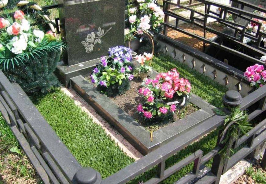 Искусственный газон будет служить долгое время, и особый уход за ним не нужен. Можно приобрести и семена обычной травы для газона, но ее нужно будет обрабатывать, чтобы газон смотрелся аккуратно, а постоянно ездить на кладбище, что подстричь траву не каждый сможет.