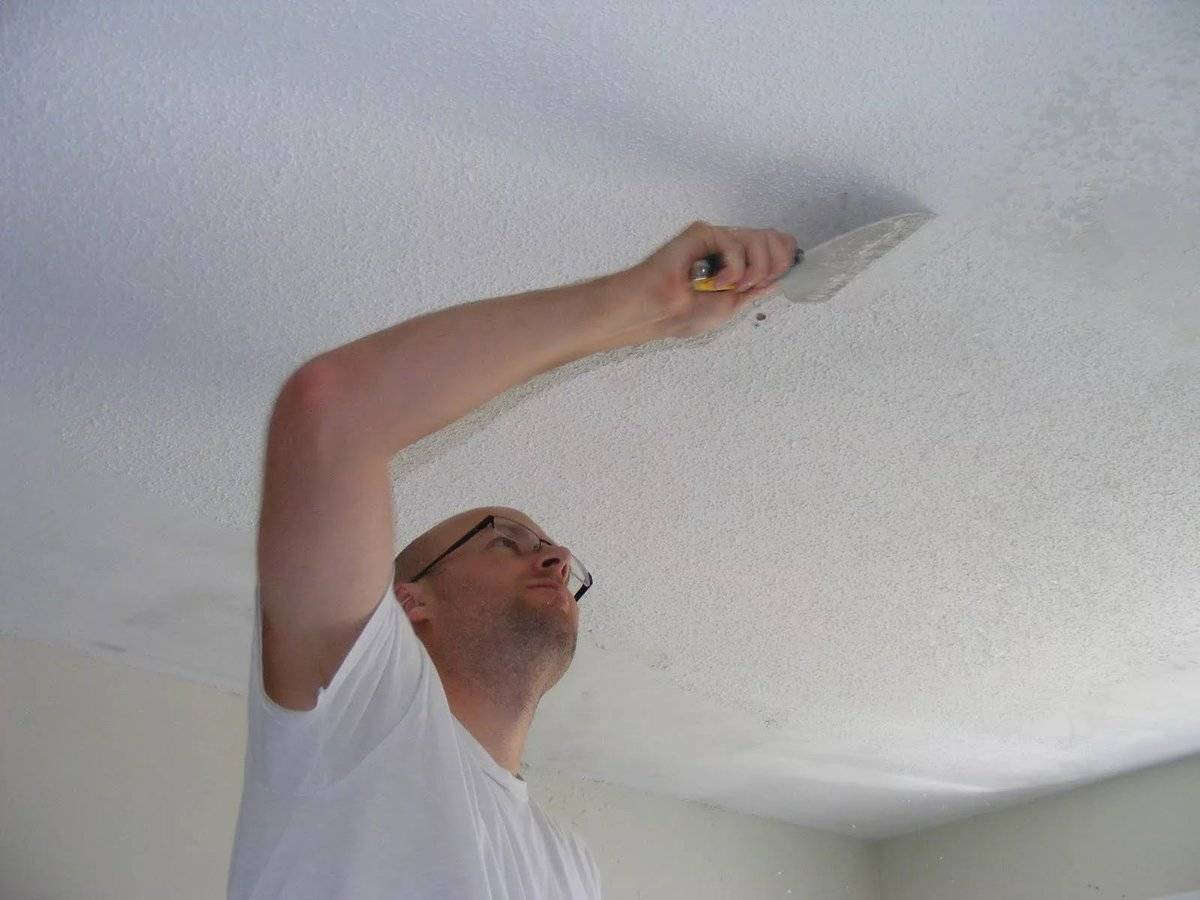 Кусочки могут отваливаться на новый потолок. Поэтому зачистку следует производить до того момента, пока больше не потребуется прикладывать усилие;