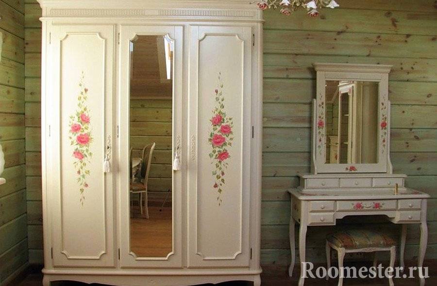 Гармоничнее всего будет остановиться на подборе тонов комнаты или сочетающимися с ней, сделать повтор рисунка или элемента где-то на поверхности шкафа. Можно поступить и наоборот: добавить по комнате какие-то элементы от декорированного элемента мебели. В любом случае шкаф и вся комната должны как-то пересекаться и сочетаться.