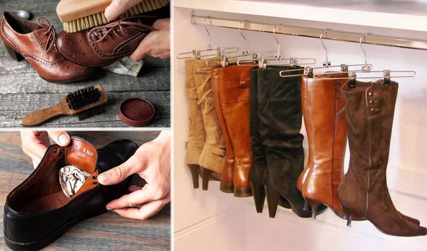 Чтобы ботинки или туфли сохранили форму, в носки помещают смятую бумагу или специальные изделия из пенопласта. Если это меховые сапоги, их обязательно надо обработать средством от моли и прочих вредителей. Хранить кожу и кожзаменитель лучше в естественном положении, не перегибая и не заламывая голенища. Низкие ботинки ставят на подошвы, а высокие укладывают горизонтально или подвешивают в чехле.