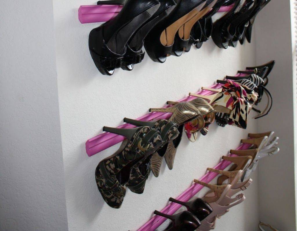- Обычные пластиковые водопроводные трубы разрезаются на равные цилиндры и соединяются между собой клеем. Не составит труда построить пирамиду, куб или сделать органайзер в виде ромба. Соты заполняются ботинками, кедами и даже сапогами.