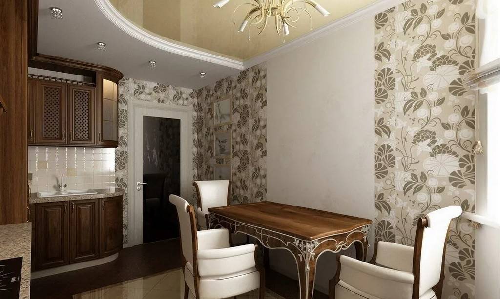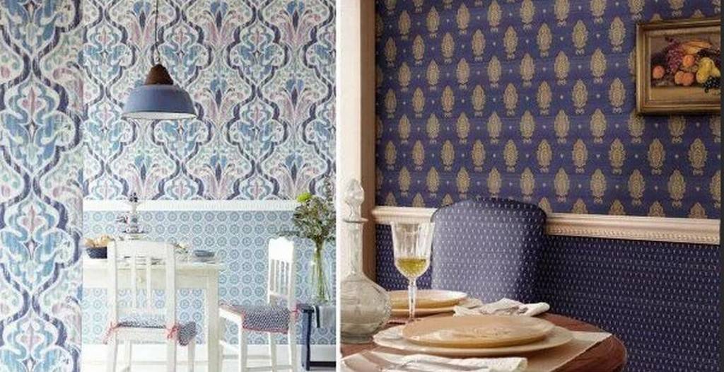 Если у вас кухня побольше, то имеет смысл скомбинировать обои горизонтально. Часто практикуется деление стены на верх-низ, а для оформления перехода используют молдинг и бордюры.